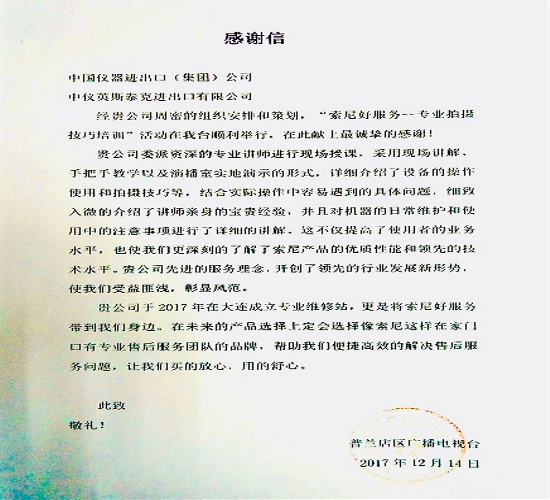 12月26日,普兰店区广播电视台向英斯泰克公司发来感谢信,感谢英斯泰克技术服务团队提供的设配操作及拍摄技巧现场教学。英斯泰克公司不断创新技术服务模式,改进技术服务理念,为客户提供技术培训、设备维修等系统服务。技服团队精湛的技...